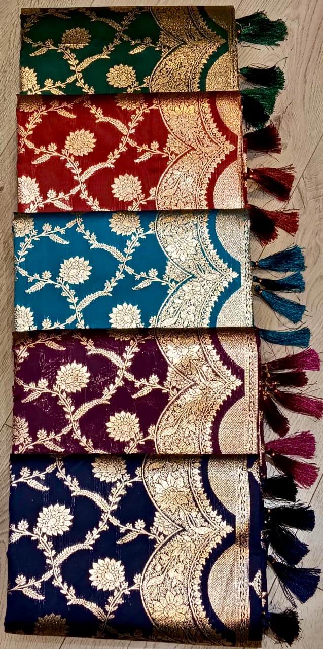 This saree features beautiful floral motifs and a richly detailed woven border that adds festive elegance, finished with tassels for a premium traditional look. Ideal for weddings, pooja, and special gatherings.