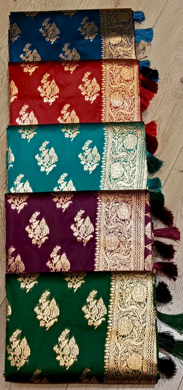 Refresh your festive look with this saree featuring classic floral butti motifs, a decorative woven border, and tassel pallu styling for a premium traditional finish. Ideal for pooja, celebrations, and family functions.