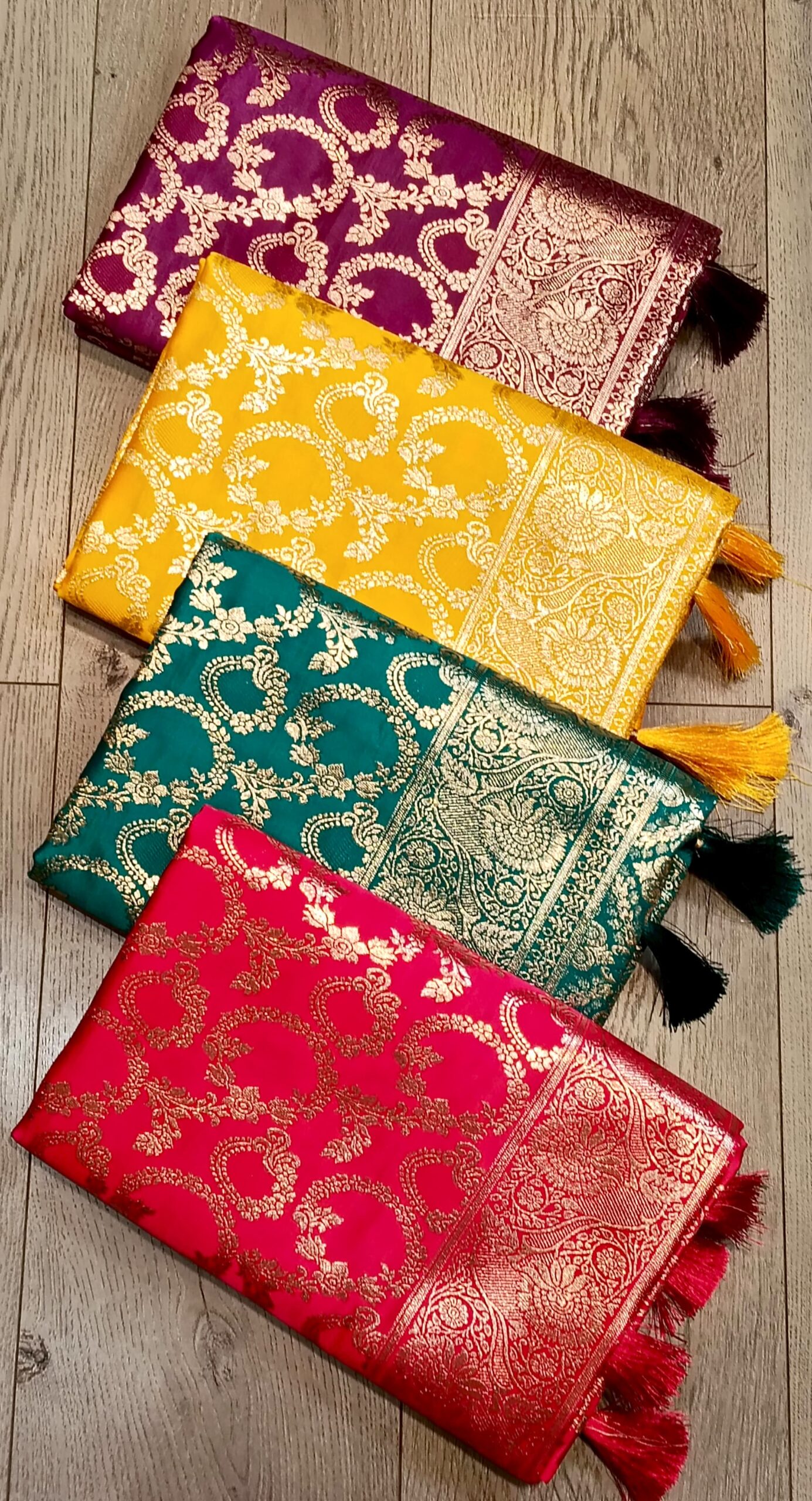 Add timeless elegance to your festive wardrobe with this saree featuring graceful floral vine zari motifs all over, a broad woven border, and a richly detailed pallu finished with tassels. The classic woven design gives it a premium traditional look, making it a perfect choice for weddings, festivals, pooja, parties, and family functions.