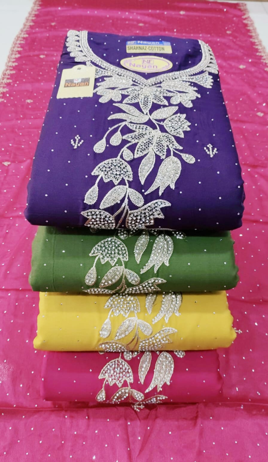 Add sparkle to your ethnic collection with this unstitched dress material featuring elegant floral stone work patterns across the front and scattered motifs all over. The coordinated dupatta and bottom complete this festive-ready look.